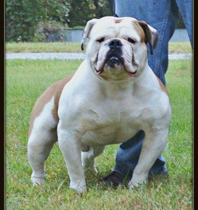 The English bulldog is bred to have wide shoulders as well as a wide head. The shoulders should have a lot of loose folds of skin. The ears are set far back on the skull and ideally should have folds that show the undersides of the ears as they curl forward over the wrinkled forehead. The big head needs to be at least as large in circumference as the length of the forelegs to the shoulder.