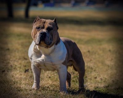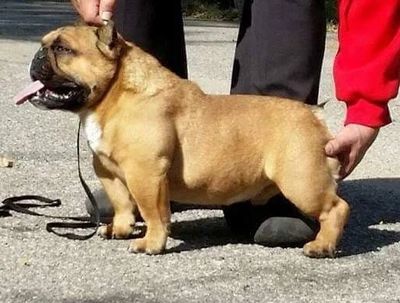 The Exotic Bully is a compact, medium sized dog with a smooth, short coat. It's tight skin is stretched over a substantially dense muscular body on a heavy boned frame. Distinguishing features are its wide chest, clearly defined, muscular shoulders and rear, blocky head, pronounced cheeks and deep intentions under eyes. It's intense expression and bulky, muscular build give the Exotic Bully a very powerful and strong appearance . This breed is docile in temperament, gentle with children, other dogs and small animals. It bonds strongly with its leader, making the Exotic Bully an excellent family companion. Aggression, viciousness or shyness is highly undesirable and very uncharacteristic for this breed.