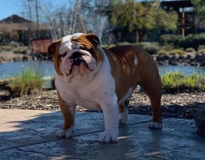 The bulldog's back should be well-rounded, with the hips widely spaced and set higher than the shoulders. The belly should be concave, and the chest rounded and well-muscled. There should be plenty of wrinkles along the length of the back, with the largest being located over the shoulder area. The short tail should ideally be set low on the rump and should be either straight or tightly coiled but not curly or long.