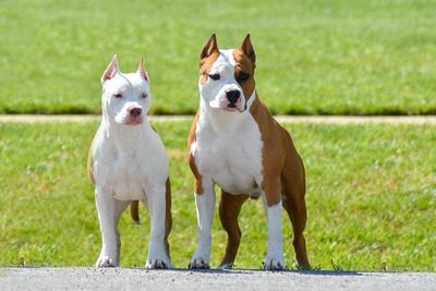 HEAD •Distinguishably large and broad head with a circumference of 20 inch or more for males or 18" or more for females measured at the very end of its jaw where the molars are and up over and around the top of its head exemplifies breed type of the American. •Wide skull, medium in length with distinct and very pronounced cheek muscles and a distinct and deep stop. • Ears- Set high and can be either natural or cropped. • Eyes- All colors equally accepted except albinism (pinkish to red) which is a disqualification. Blue eyes, lack of pigment around the eyes are undesirable. • Eye shape is oval to almond shape, low down in skull and set far apart. Round eyes are undesirable, and bulging or protruding eyes are a fault. • Visibility of the haw should be minimal.  • Muzzle- Blocky or slightly squared to fall away abruptly below eyes and broad in width. Length to be shorter than the length of the skull. The distance from the tip of the nose to the stop should be roughly one- third of the distance from the tip of the nose to the back of the head The topline of the muzzle is to be straight with nose neither pointed nor turned up in profile. • Jaws- well defined. • Under jaw- to be board strong and parallel to muzzle, never turning upward. • Lips- semi close and even, minimal looseness accepted but not preferred.. • Upper Teeth- to meet tightly outside lower teeth in form or scissor bite. • Nose- Large with wide open nostrils. All colors/pigment acceptable except albinism (light pink in color).